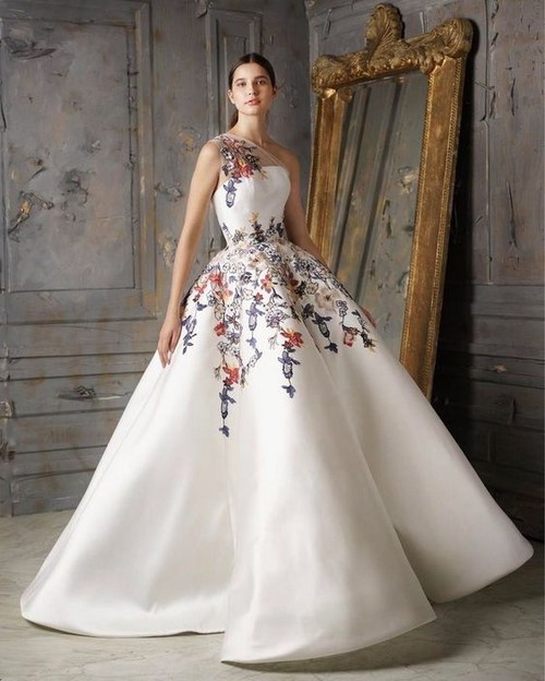 Den nye trenden blant ideene til en kjole med fullt skjørt vil være flott i asymmetriske eksklusiver.