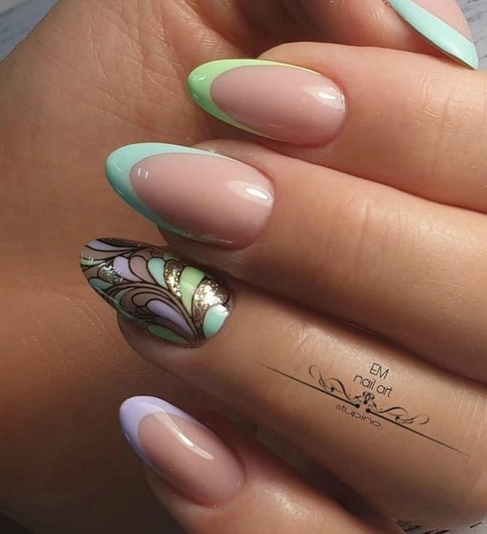 Om du vill få en modern pastellmanikyr på ett universellt sätt, väljer du geometriska mönster och abstrakta tekniker.