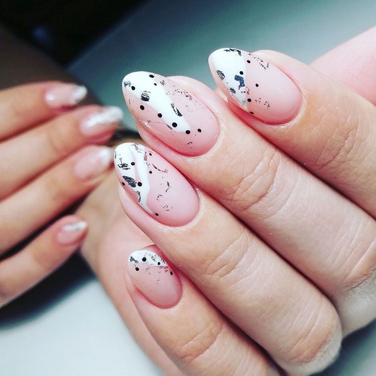Matta och glansiga pastellnaglar med prickade vita prickar kommer att vara av intresse för många, som kan arrangeras i form av ett hål, både abstrakt och linjärt.