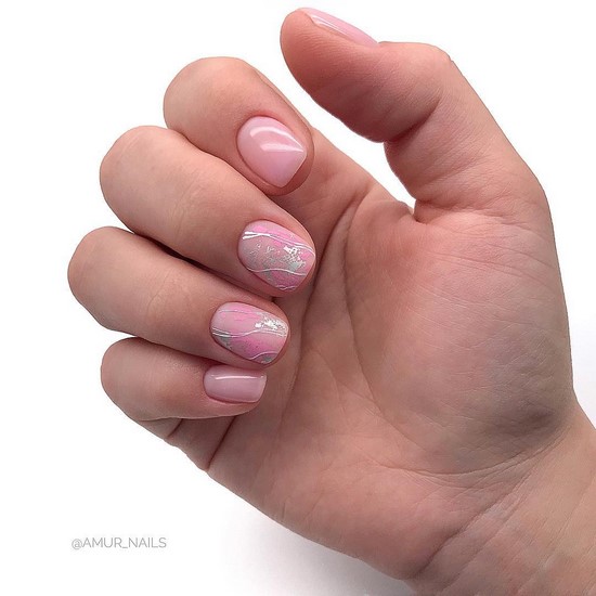 Säsongens trend är pastellmanikyr med flytande metall, vilket imponerar av den ovanliga designen av naglarna med droppar kvicksilver.